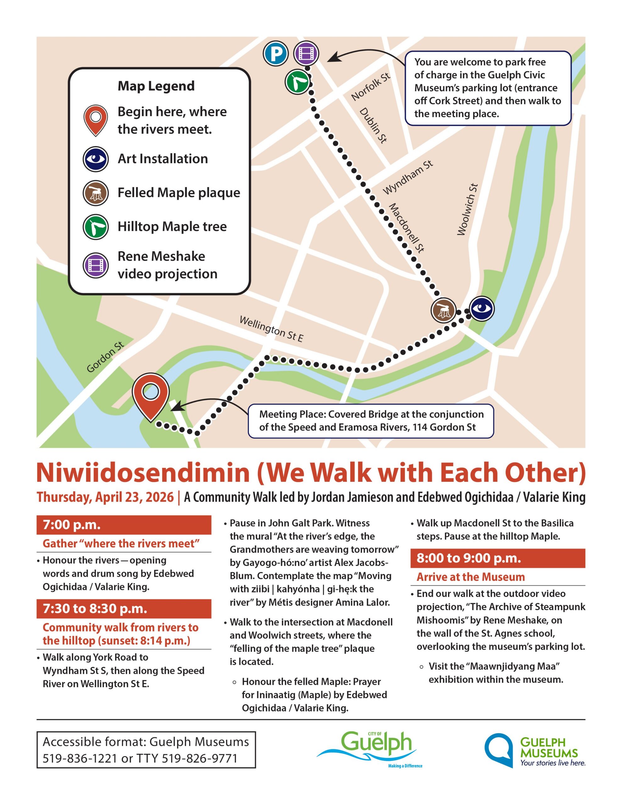On the evening of Thursday, April 23, join us for a community walk from the rivers who meet in Guelph (Speed and Eramosa) to the hilltop where the Museum is located. The walk is guided by Jordan Jamieson and Edebwed Ogichidaa / Valarie King. Jordan Jamieson is an Anishinaabe knowledge keeper, leader and youth ambassador from Mississaugas of the Credit First Nation, who is passionate about fostering productive dialogue between Indigenous and settler communities. Edebwed Ogichidaa / Valarie King is a knowledge keeper, educator, and elder from Mississaugas of the Credit First Nation.